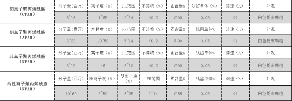 PAM的平均分子量從數(shù)千到數(shù)千萬以上,沿鍵狀分子有若干官能基團,在水中可大部分電離,屬于高分子電解質(zhì)。根據(jù)它可離解基團的特性分為陰離子型聚丙烯酰胺、陽離子型聚丙烯酰胺、和非離子型聚丙烯酰胺。