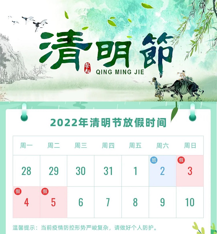 根據(jù)《國務(wù)院辦公廳關(guān)于2022年部分節(jié)假日安排的通知》,清明節(jié):4月3日至5日放假調(diào)休,共3天。
