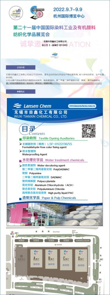 第二十一屆中國國際染料工業(yè)及有機顏料紡織化學品展覽會于2022.9.7-9.9在杭州國際博覽中心隆重舉行,無錫市田鑫化工有限公司誠摯邀請您蒞臨我司展位!