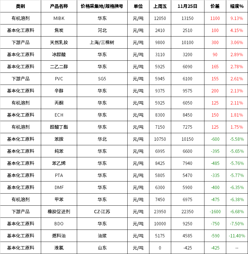 化工市場(chǎng)魔幻的一周:63個(gè)產(chǎn)品下跌,最高暴跌1600元!僅26個(gè)產(chǎn)品上漲,MIBK怒漲1100!
