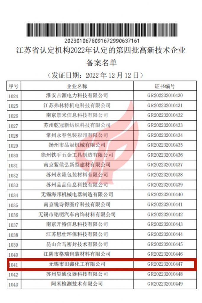 喜訊丨無錫田鑫化工獲評“高新技術(shù)企業(yè)”