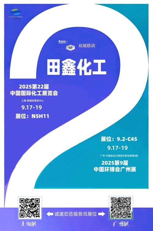 2025年9月17-19日上海化工展和環(huán)博會(huì)廣州展同時(shí)開(kāi)展,田鑫化工參展信息如下: